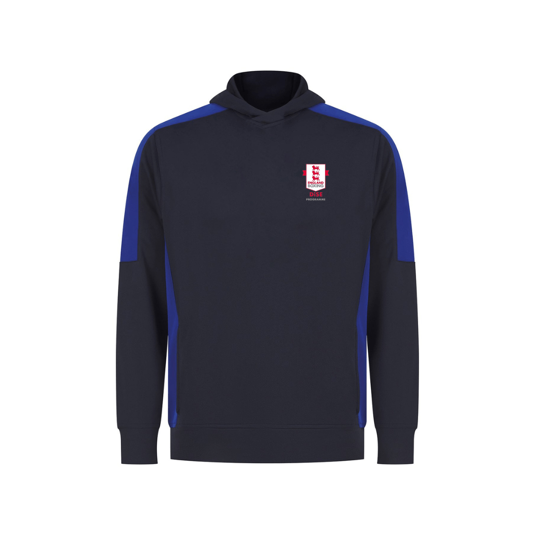 Unisex adults’ polyester hoodie with brushed back fleece inner for comfort. Contrast sleeves and side panelling on contrast only. Ribbed cuffs and hem. Crossover hood neck at centre front. Zipped welt pocket in front panel side seam. Three-piece hood.