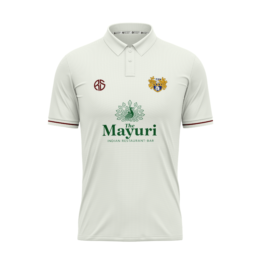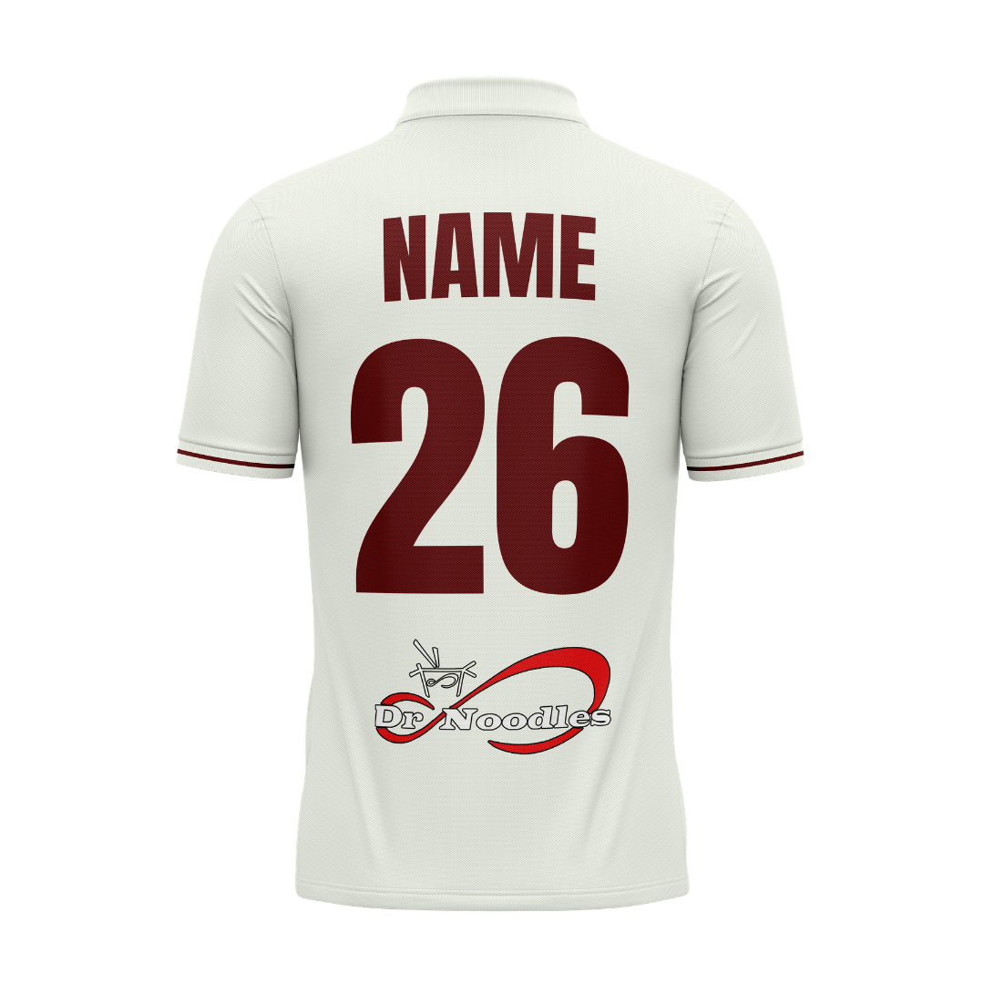 Rugby Cricket Club Off-White Playing Shirt Short Sleeved. Fully Sublimated names, numbers, and sponsor logos. Made from dot-mesh polyester. Embroidered club logo.